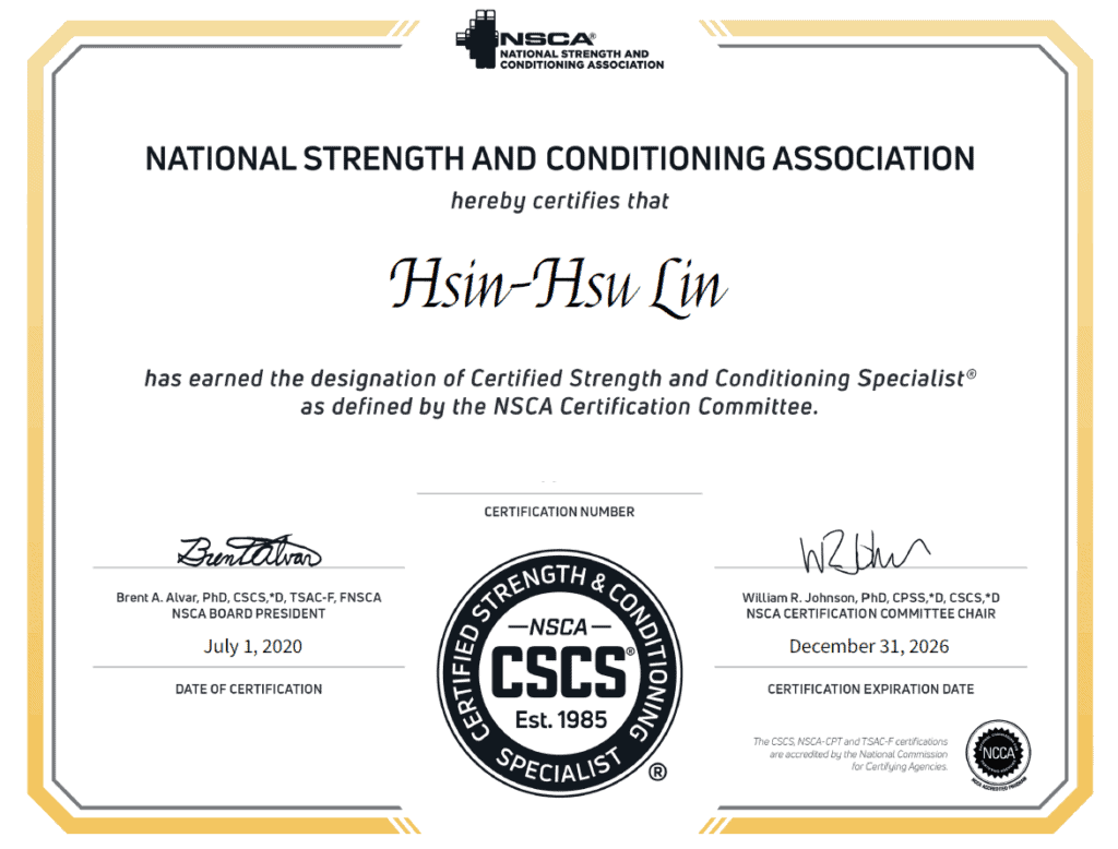 - 美國國家肌力體能協會肌力體能訓練專家 (NSCA CSCS)