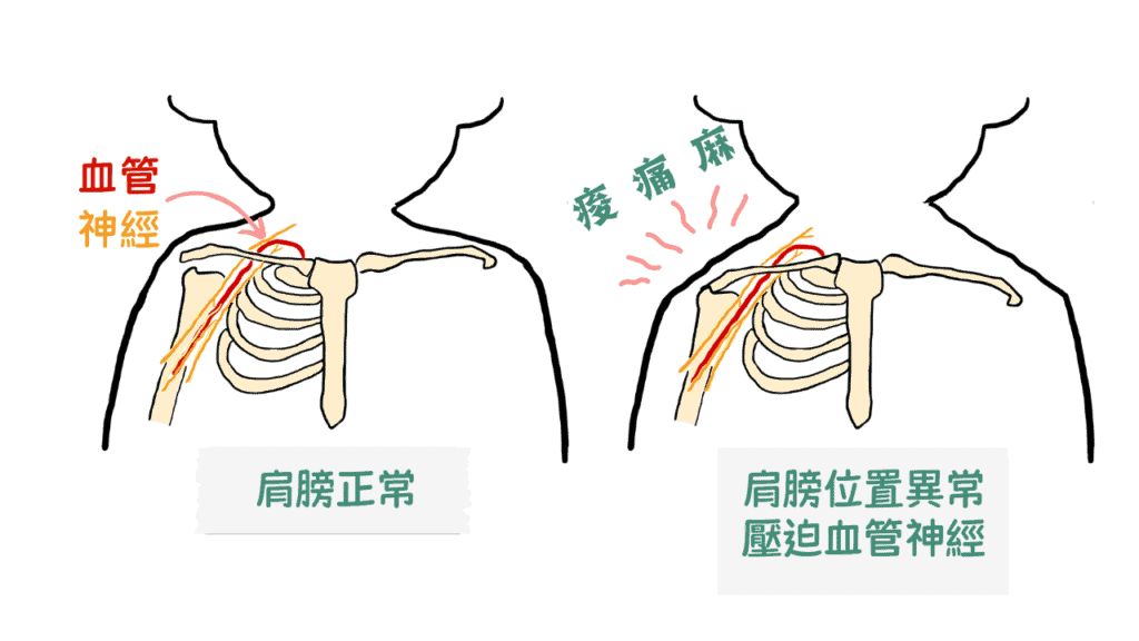 當頭部長期前移,伴隨肩膀位置改變,可能影響胸廓出口的空間,此處有非常多的血管與神經通過。